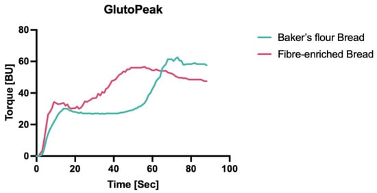 GlutoPeak profiles of baker’s flour control and fibre-enriched mixture. Gluten network development characterisation, as dough torque (BU) over mixing time (s).