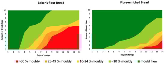 To evaluate the shelf life of the bread, the microbial growth was monitored over 14 days using the mould environmental challenge method reported by Sahin, Axel and Arendt (2017) and Dal Bello et al. (2007) with minor amendments [,]. Ten centre slices were placed on a sterile metal rack, and both sides of the bread slice were exposed to the environment for 5 min. Each slice was packed in a sterile bag and heat-sealed, and a filter pipette was placed in each bag to allow constant aerobic conditions to predominate. A pre-sterilised and temperature- and humidity-controlled chamber (KOMA SunRiser, Roermond, The Netherlands) was used to store the samples (20 ± 1 °C and 50% RH). The samples were than analysed daily for 14 days in total. The mould growth progression on each bread slice was visually assessed and rated as “mould free”, “mould growth < 10%”, “10–24% mould growth”, “25–49% mould growth” and “mould growth > 50%”.
