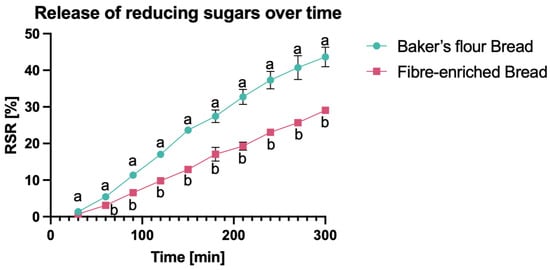 An in vitro digestion assay tailored for fibre-enriched products was performed following the methodology outlined by Brennan and Tudorica (2008) []. The assay involved enzymatic degradation of starch into reducing sugars over a specified duration. Briefly, 4 g of fresh, crushed bread was exposed to a 30 min proteolytic treatment using pepsin solution. After this, samples were placed in 1-inch-width dialysis tubing, suspended in sodium potassium phosphate buffer (pH 6.9), and incubated for 5 h with a pancreatic -amylase solution. Samples were taken every 30 min and dialysis tubes were inverted three times every 15 min. To establish the concentration of reducing sugars (maltose) released over time, 100 L of each sample was diluted with 100 L of 40 mM 3,5-dinitrosalicyclic acid solution, heated to 100 °C for 15 min and then diluted with 1 mL of deionised water. Analysis was completed in duplicate. Reducing Sugar Release% (RSR%) over time was calculated according to Brennan and Tudorica (2008) using the following formula []: