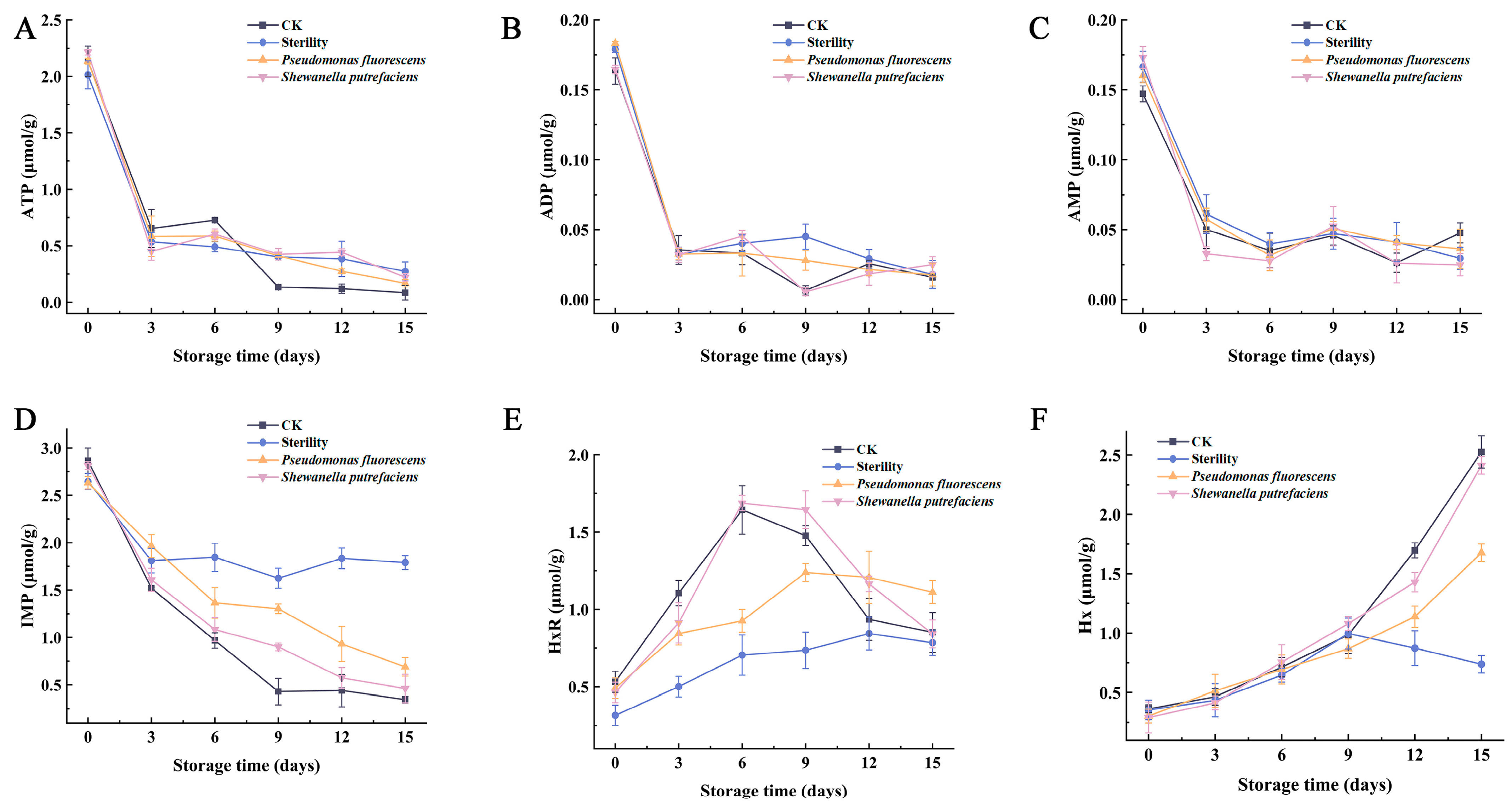 Chen, B.; Yan, Q.; Xu, T.; Li, D.; Xie, J. Effect of Specific Spoilage Organisms on the Degradation of ATP-Related Compounds in Vacuum-Packed Refrigerated Large Yellow Croaker (Larimichthys crocea). Foods 2024, 13, 1989. https://doi.org/10.3390/foods13131989