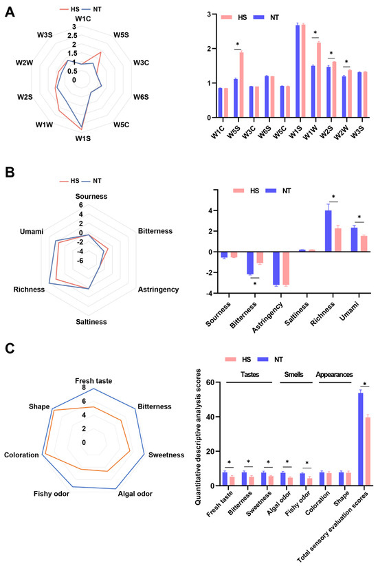 The effect of chronic heat stress on sensory properties of oyster C. ariakensis: (A) Radar and bar chart for electronic nose responses; (B) Radar and bar chart for electronic tongue responses; (C) Radar and bar chart for quantitative descriptive analysis. The total scores for sensory evaluation are the sum of the sensory scores for tastes (fresh taste, bitterness, and sweetness), smells (algal odor and fishy odor) and appearance (coloration and shape). Higher sensory evaluation scores for tastes, smells, and appearance indicate greater acceptability. NT, normal group. HS, heat stress group. Statistical analyses were performed using Student’s t-test, * p < 0.05.