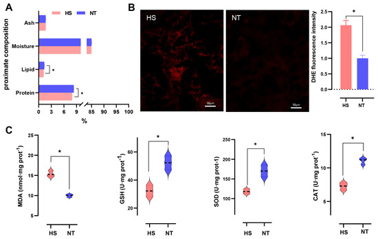 The effect of chronic heat stress on proximate composition and antioxidant abilities of oyster C. ariakensis: (A) Proximate composition; (B) ROS was revealed by DHE staining; (C) analysis of antioxidant abilities (GSH, SOD, CAT and MDA); NT, normal group. HS, heat stress group. Statistical analyses were performed using Student’s t-test, * p < 0.05.