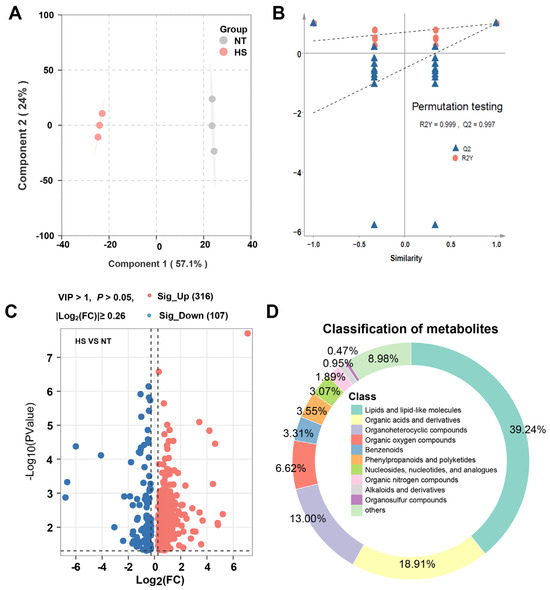 The effect of chronic heat stress on non-volatile metabolites of oyster C. ariakensis: (A) OPLS–DA; (B) OPLS–DA model permutation test plots; (C) Volcano plot; (D) Categorical pie chart of differential metabolites. NT, normal group. HS, heat stress group.