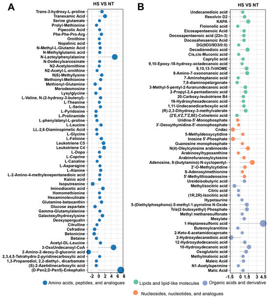 The expression profiles of amino acids, fatty acids, nucleotides, and organic acid-related precursors: (A) Lollipop graph for fatty acids, nucleosides, organic acids; (B) Lollipop graph for amino acids. The precursor substances meet the criteria: VIP > 1.0, p < 0.05, and |log2(FC)| ≥ 0.26. NT, normal group. HS, heat stress group.