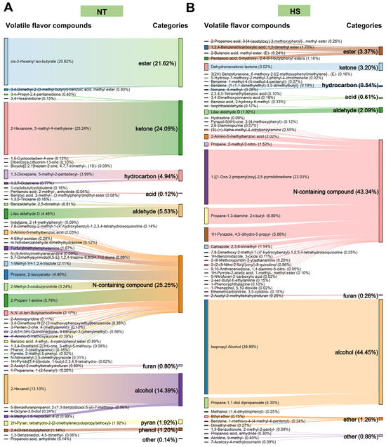 The effect of chronic heat stress on volatile compounds of oyster C. ariakensis: (A) Relative content (%) of volatile compounds for the NT group; (B) Relative content (%) of volatile compounds for the HS group. NT, normal group. HS, heat stress group.