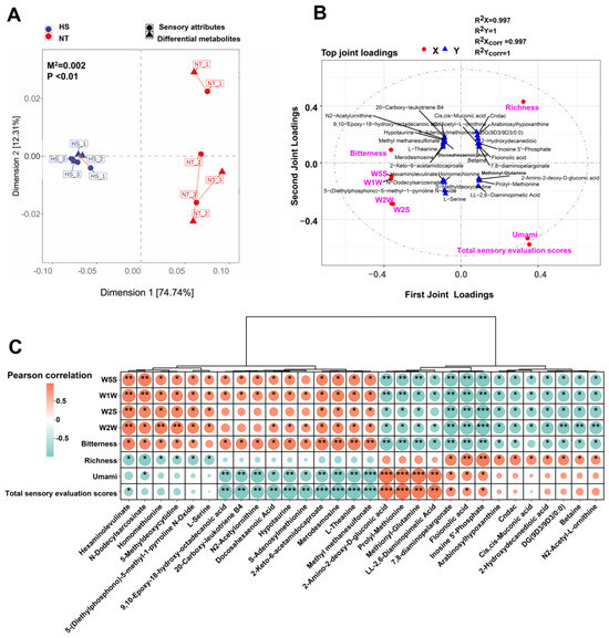 The correlation analysis between differential metabolites and sensory properties: (A) Procrustes analysis between differential metabolites and sensory properties; (B) the association between differential sensory properties and differential metabolites was evaluated by O2PLS; (C) Pearson’s correlation analysis for key differential metabolites and sensory properties. * p < 0.05, ** p < 0.01, *** p < 0.001. Sensory attributes include W5S, W1W, W2S, W2W, bitterness, richness, umami, and sensory evaluation. NT, normal group. HS, heat stress group.