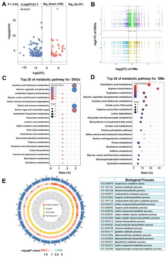 The effect of heat stress on metabolic pathways in oyster C. ariakensis: (A) Volcano plot; (B) Nine-quadrant diagram of DEGs and DMs; (C) Top 20 in KEGG enrichment analysis for DEGs; (D) Top 20 in KEGG enrichment analysis for DMS; (E) GO annotation for DEGs. NT, normal group. HS, heat stress group.