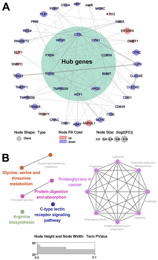 To investigate the potential mechanisms of heat stress-induced sensory properties reduction in oysters, a protein–protein interaction (PPI) network was constructed. The ten hub genes (CTSL, CPA1, CORIN, BHMT, APOD, ACY1, TMPRSS9, TGFBI, PXDN, and HPGD) were selected from the PPI network by using the cytoHubba plug-ins (Figure 8A). The expression levels of the hub genes were significantly decreased in the HS group compared to the NT group. KEGG enrichment analysis showed that the hub genes were mainly enriched in organic acid metabolism and oxidation-related cellular processes (Figure 8B).