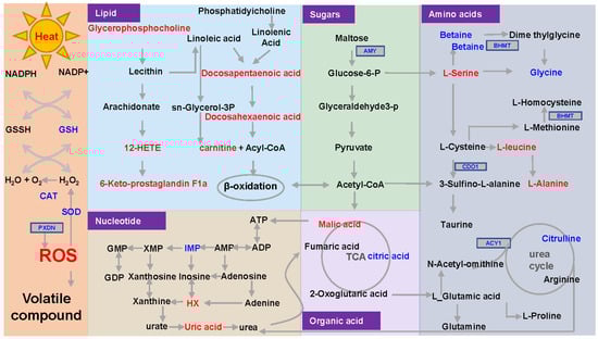Underlying sensory properties formation network. Red font indicates up-regulating gene or metabolite, blue font indicates down-regulating gene or metabolite. ROS, Reactive Oxygen Species; SOD, superoxide dismutase; CAT, catalase; PLB1, phospholipase B1; AMY, amylase; BHMT, betaine homocysteine methyltransferase; CDO1, cysteine dioxygenase 1; ACY1, amino-acylase 1. PXDN, peroxidasin.