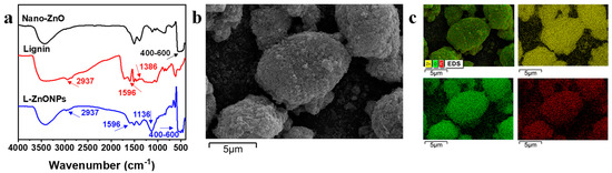 Figure 2b,c show the SEM images and EDS images of L-ZnONPs, respectively. The SEM images depict the ellipsoidal architecture of the nanoparticles, featuring both large and small particles. Furthermore, the surface of the nanoparticles is rough and porous; these characteristics contribute to an enlarged specific surface area. Moreover, Nano-ZnO appears to be firmly adhered to the lignin surface, consistent with previous research [43]. The EDS mapping images of the L-ZnONPs illustrate the partitioning of C, Zn, and O. Notably, these three elements (C, Zn, and O) exhibit a uniform distribution, providing further evidence of the successful combination of lignin and Nano-ZnO.