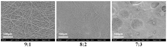 To determine the optimal mixing ratio of PVP and KGM solutions, we spun the nanofibers in three ratios of 9:1, 8:2, and 7:3 and evaluated the spinning effect by examining the microscopic morphology of the nanofibers (Figure 3). It shows that nanofibers spun in a ratio of 8:2 exhibit tangles and droplets. Additionally, nanofibers spun with a 7:3 ratio show even more droplets and tangles. Fortunately, the nanofibers spun in the 9:1 ratio have a good shape and are without liquid droplets or tangles. Therefore, the 9:1 ratio was chosen for subsequent experiments.
