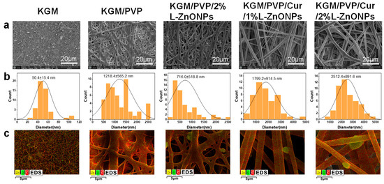Figure 4a–c showcases SEM images, diameter distribution histograms, and EDS mapping images of nanofibers. Pure KGM nanofibers exhibit a significant presence of beaded and fractured fibers. This can be accounted for by the inadequate evaporation of the solvent during the electrospun process and the limited spinnability of KGM itself. In contrast, both KGM/PVP and KGM/PVP/2%L-ZnONPs nanofibers display no tangles or droplets but rough surfaces. This phenomenon may be the result of the fiber structure collapsing due to rapid moisture absorption [44]. In addition, the absence of beading and fiber fractures can be traced to the reduction in interactions between KGM molecules facilitated by PVP, the phenomenon supported by prior research [45]. However, upon the addition of Cur, both KGM/PVP/Cur/1%L-ZnONPs and KGM/PVP/Cur/2%L-ZnONPs nanofibers exhibit smooth surfaces. This change in nanofiber morphology may be ascribed to the hydrophobic nature of Cur, which enhances the fiber structure.