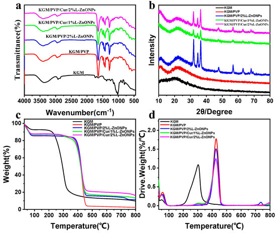 In Figure 5a, the ATR-FTIR spectrum of the nanofibers is presented. For pure KGM nanofibers, the eigenpeak at 3359 cm−1 corresponds to the stretch vibration of -OH, while the eigenpeaks at 2930 cm−1 and 1027 cm−1 are associated with the stretching vibration of C-H and C-O, separately [47,48]. Additionally, the eigenpeak at 1640 cm−1 is linked to the stretching vibration of intramolecular hydrogen bonding, while the eigenpeak at 1730 cm−1 relates to the vibrational stretching of the C=O within the KGM acetyl group and the C-O group within intermolecular hydrogen bonding [48,49]. Furthermore, the eigenpeaks at 874 cm−1 and 807 cm−1 are connected to the vibrational stretching of the mannan unit of the KGM [45,50]. In the case of KGM/PVP nanofibers, characteristic peaks of PVP are observed in addition to those of KGM. Specifically, the peak at 1495 cm−1 is assigned to the vibrational stretching of C-N and the bending vibration of N-H, while the peaks at 1424 and 1291 cm−1 are linked to the bending vibration of C-H and C-N, correspondingly [51,52]. In addition, the eigenpeaks shift from 3359 to 3397 cm−1 and from 1640 to 1642 cm−1 with changes in transmittance, indicating an enhancement of molecular interaction between KGM and PVP through hydrogen bonding [53]. For KGM/PVP/2%L-ZnONPs, no new functional groups are observed apart from the characteristic peaks of KGM, PVP, and nanoparticles, which suggests that there are solely physical interactions between the nanoparticles and the KGM/PVP nanofibers matrix. However, the characteristic peaks become less pronounced in the nanofibers with the addition of Cur, which may be due to the encapsulation of Cur within the structure formed by the nanofiber matrix, restricting the stretching vibrations of the functional groups [24].