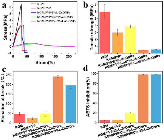 The stress–strain versus strain graph, TS, and EAB of the nanofibers are depicted in Figure 6a–c. The TS of KGM/PVP nanofibers is inferior to that of pure KGM. This may be attributed to the finer average diameter and higher packing density of pure KGM nanofibers [56]. Normally, enhancing both TS and EAB of composites simultaneously can be challenging [53,57]. However, it is interesting to note that doping the nanofibers with nanoparticles leads to improvements in both TS and EAB. This enhancement can be owed to the homogeneous distribution of nanoparticles in the nanofibers [58]. A similar effect was identified by Wang et al., who found that QLS/ZnO NCs could upgrade the mechanical performance of PU films [59]. Conversely, the incorporation of Cur resulted in a deterioration of the TS of the nanofibers. However, it significantly enhanced the EAB (>241%), indicating that the nanofibers exhibited good tensile properties. These results suggest that KGM/PVP/Cur/L-ZnONPs nanofibers possess good ductility but lower strength.