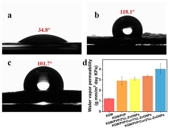 Surface wettability is a crucial parameter for food packaging, and hydrophobic food packaging is more suitable for practical applications [62]. The WCA measurements for the pure KGM nanofibers, KGM/PVP/Cur/1% L-ZnONPs nanofibers, and KGM/PVP/Cur/2% L-ZnONPs nanofibers are 34.8°, 118.1°, and 101.7°, respectively (Figure 7a–c). The increase in WCA of the nanofibers after adding Cur can be attributed to the fact that Cur is a naturally hydrophobic polyphenol [63]. The hydrophobic benzene ring within Cur has a more pronounced effect on the nanofibers than the polar hydroxyl group [64]. Conversely, the incorporation of nanoparticles induced the decrease in the WCA of the nanofibers, which can be attributed to the surface hydrophilicity of the nanoparticles. This phenomenon has also been demonstrated by Daniele Del Buono et al. [65]. Nanofibers are considered hydrophobic materials if they have a WCA value of ≥90° [46]. Hydrophobic materials possess excellent water repellent properties, which are essential for preventing moisture loss and are critical in food packaging [66].