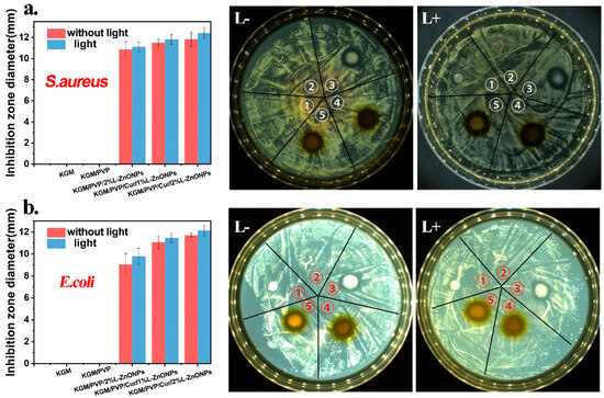 The photodynamic antimicrobial activity of nanofibers against S. aureus and E. coli is investigated and the outcomes are presented in Figure 8a,b. Typically, a larger inhibition zone around the nanofiber discs indicates a more effective antibacterial activity of the nanofibers [57]. It is observed that there is no inhibition zone around the KGM and KGM/PVP nanofibers discs, indicating that they lacked antimicrobial activity. However, the nanofibers containing nanoparticles and Cur displayed substantial antimicrobial capabilities against both S. aureus and E. coli bacteria. Furthermore, after irradiation with 808 nm red light, the inhibition zone around the nanofibers is larger, indicating that irradiation could enhance the antibacterial activity of the nanofibers. This enhancement may be due to the inhibitory effect on bacterial growth resulting from the presence of nanoparticles and Cur in the nanofibers after light irradiation, leading to the production of ROS [59].