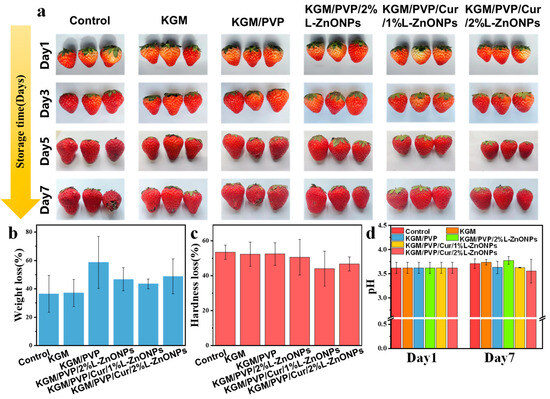(a) The changes in visual appearance; (b) weight loss; (c) hardness loss; and (d) pH changes of strawberries before and after storage for 7 days.