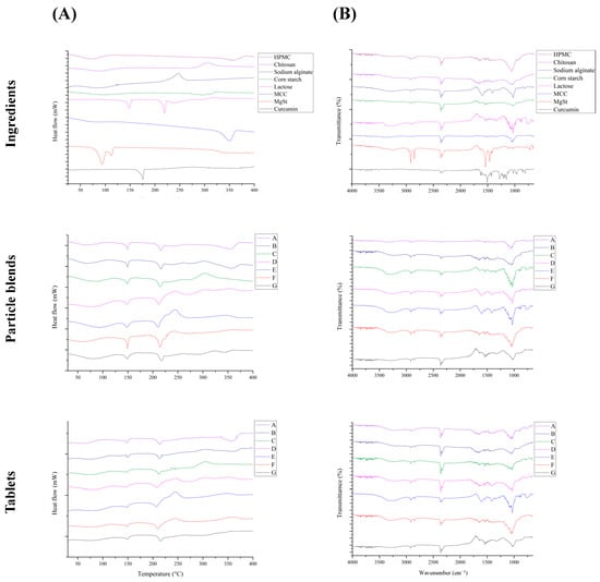 Thermograms and FTIR spectra of ingredients, particle blend, and combined curcumin controlled-release tablets. (A) Differential scanning calorimetry; (B) Fourier-transform infrared spectroscopy. HPMC: hydroxypropyl methylcellulose, MCC: microcrystalline cellulose, and MgSt: magnesium stearate.