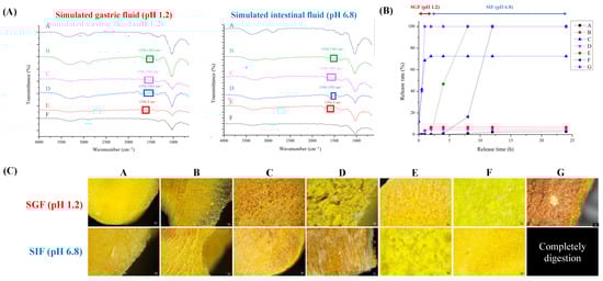 The release profiles of the tablets are shown in Figure 3. Figure 3A,B show the FTIR spectra and release properties of the tablets subjected to simulated gastrointestinal fluids.