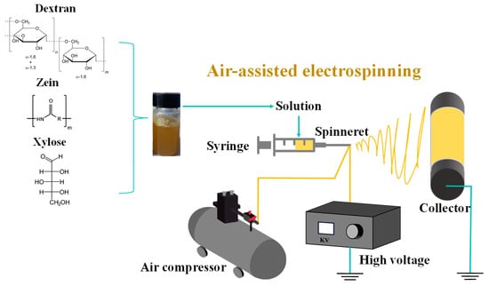 Zein, a proteinaceous biopolymer isolated from maize with advantageous physicochemical characteristics, has been increasingly recognized for its potential in sustainable food packaging solutions. Zein-based nanomaterials can be prepared using electrospinning technology [2], and various strategies have been explored to enhance the electrospinnability of zein and improve the fiber morphology, mechanical properties, and functionality. For instance, hybrid electrospinning with other biopolymers has enabled the preparation of gelatin/zein [3], cellulose acetate/zein [4], dextran/zein [5], pullulan/zein [6], and gluten/zein [7] nanofibers. Most of the studies on the fabrication of zein-based nanofibers apply traditional electrospinning methods, which result in low yields and are not suitable for industrial applications. Dextran is a hydrophilic, biodegradable biopolymer commonly found in bacterial polysaccharides [8]. Pure dextran nanofibers have been fabricated in DMSO, DMF, or water solutions [9]. Various synthetic polymers has been introduced to reinforce the dextran nanofiber’s properties, such as polylactide-co-glycolide [10,11], polyurethane [12], and polyvinylpyrrolidone [13]. However, few studies have explored the hybrid electrospinning of dextran with biopolymers. In our previous study, the dextran/zein nanofibers were fabricated with a feeding rate of 1.0 mL/h through traditional electrospinning [5]. By addressing the limitation of the yield of traditional electrospinning, our study focuses on improving the fabrication process of nanofibers using electro-blown spinning [14], which is a combination of electrospinning and solution blowing that facilitates nanofiber formation and increases the yield of nanofibers [15,16]. It is applied in air filtration [17,18], yarns [19], batteries [20], nanofiber skin [21], and wound healing [22].