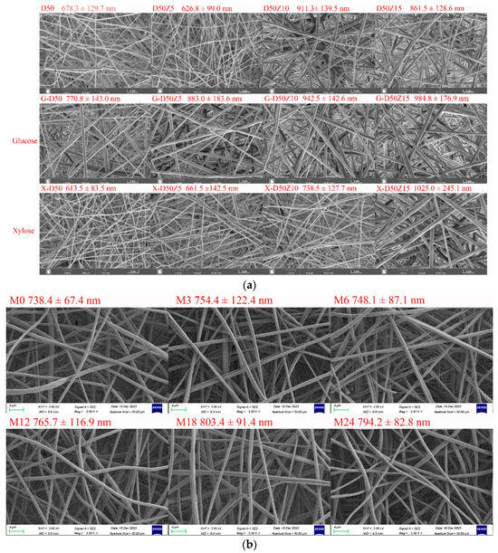 (a) SEM images and fiber diameter distributions of dextran/zein nanofibers and those containing glucose or xylose, respectively. D50Z0, D50Z5, D50Z10, and D50Z15 are the nanofibers fabricated using solutions with 50% (w/v) dextran and 0–15% (w/v) zein, respectively. G and X refer to the solutions with 5% (w/v) glucose or xylose. (b) X-D50Z5 nanofibers prepared at a temperature of 60 °C and a relative humidity of 50% for 0, 3, 6, 12, 18, and 24 h; the corresponding samples were denoted as M0, M3, M6, M12, M18, and M24, respectively.