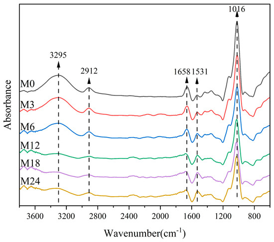 Relative absorbance of FTIR spectra before 0 (M0) and after cross-linking for 3 h (M3), 6 h (M6), 12 h (M12), 18 h (M18), and 24 h (M24).