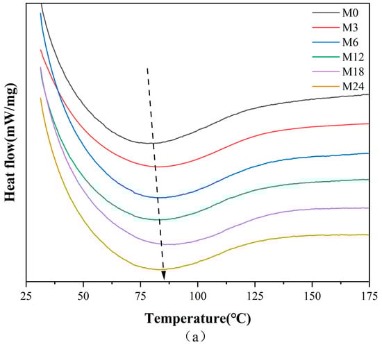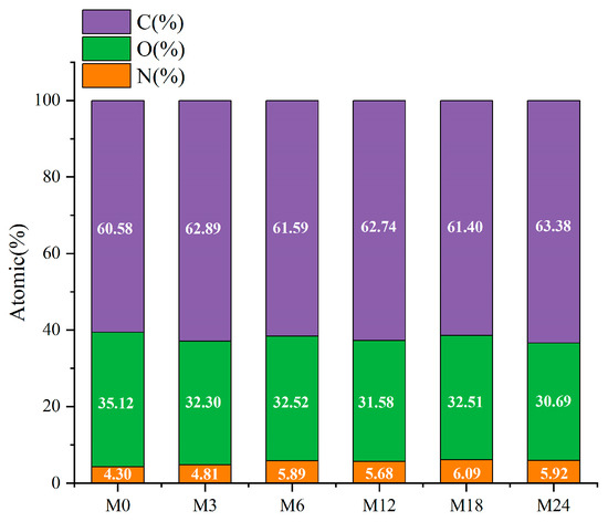 The high-resolution C1s spectra displayed in Figure 7 reveal three distinct peaks at 284.7, 286.2, and 288.0 eV, which correspond to C–C/C=C, C–O/C–N, and O–C=O, respectively [43]. The proportion of C–C/C=C increased from 35.12% (M0) to 44.16% (M3) and then to 40.77% (M6), 42.82% (M12), 41.16% (M18), and, finally, 44.31% (M24). In accordance with the increase in hydrophobicity of the nanofibrous films after the MR, the proportion of O–C=O decreased with prolonged heating time.