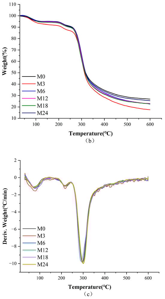 Thermodynamic analysis diagram before 0 (M0) and after cross-linking for 3 h (M3), 6 h (M6), 12 h (M12), 18 h (M18), and 24 h (M24): (a) DSC curves; (b) TGA curves; (c) TGA derivative curves.