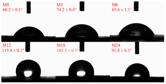 Water contact angles before 0 (M0) and after cross-linking for 3 h (M3), 6 h (M6), 12 h (M12), 18 h (M18), and 24 h (M24).