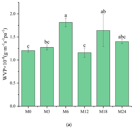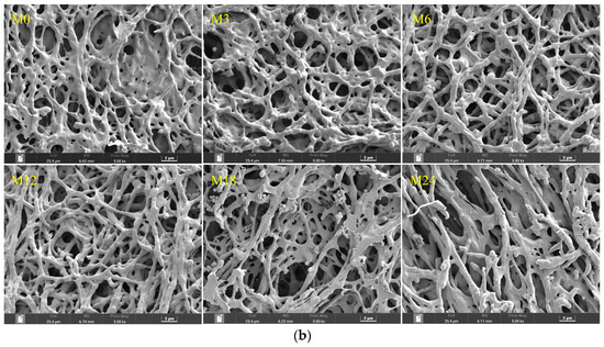 The WVP of films is one of their most important properties to determine their applicability as packaging materials. Fresh products need to be packaged in films with high WVP, whereas processed foods require films with low WVP for long-term storage. As shown in Figure 9a, compared with M0, M6 and M18 exhibited a substantially higher WVP. However, no marked changes were observed for the other samples. WVP depends on the absorption and diffusion mechanisms of water vapor. These mechanisms are intimately connected to the composition, specifically the ratio of hydrophilic to hydrophobic components, and the architecture of polar and nonpolar groups [35,46]. The inherent hydrophilicity of substances, such as dextran and xylose, promotes water-induced swelling in nanofibers, thereby decreasing the porosity, which may retard the diffusion of water vapor, as shown by the decreased WVP. However, the MR between the protein and xylose increased the hydrophobicity, as indicated by the water contact angle results. The increased hydrophobicity of the nanofibrous film facilitated the retention of the nanofiber morphology and porosity when water vapor diffused through the film, which can explain the increased WVP of the cross-linked nanofibrous film. Liu et al. [31] also observed a remarkably increased WVP of a gelatin/zein/glucose nanofibrous film after MR cross-linking. Figure 9b exhibits SEM images of the nanofibers after immersion in water for 24 h. The M0 and M3 nanofibers agglomerated, and the porous structure was lost after water treatment. After the MR cross-linking, the porous structures of M6, M12, and M18 were maintained. In wound dressing application, a high WVP is conducive to the wound exudate. Hence, the cross-linked dextran/zein nanofibers might find application as a delivery system for fresh food packaging or wound healing dress.