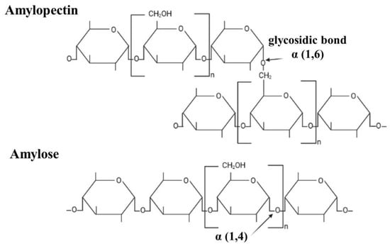 Bread is considered a solid, heterogeneous, and unstable foam, constituted by crust and crumbs, whose main components are starch granules displayed in a continuous proteic matrix [8]. These macromolecules comprise amylose and amylopectin (Figure 1) [9]. Amylose is a linear polymer formed by glycose monomers linked by α-1,4 glycosidic bonds, whereas amylopectin is a branched polymer with α-1,6 bonds [10]. Amylose concentrations in cereals range from 18 to 33%, while amylopectin concentrations range from 70 to 80% [11].