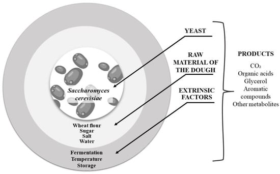 Saccharomyces cerevisiae is the preferred yeast for foods, beverages, and breadmaking [57]. In the bakery industry, yeast is a major leavening agent that enlarges volume [58,59,60] by producing carbon dioxide through the alcoholic fermentation of sugars and reducing the time needed to obtain the desired bread volume [60]. Besides improving dough’s rheological properties, yeast produces flavor initiator compounds [61].