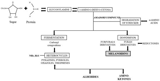 A protein reacts with sugar during browning reactions, creating glycosylamine (Figure 4). This chemical compound loses a water molecule to form a Schiff base, which undergoes an Amadori transposition reaction. Amadori’s compounds decompose into a reorganized sugar and an amino acid residue [88]. At the end of the Maillard reaction, reagents and part of the sugars condense to form brownish nitrogen compounds [89] with high molecular weights [90]. These molecules are responsible for the brown aspect of baked products [47]. The different molecules generated in the degradation of the Strecker as the final stage of the Maillard Reaction are a group of volatile heterocyclic compounds such as: pyrazines, pyrroles, pyridines, among others, and these contribute to the taste and aroma of many foods [91]. Pyrazines and pyrroles contribute directly to the aroma of bread [92]. Pyrazines are responsible for the nutty taste and roasted aroma [93].