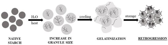 As shown in Figure 5, starch retrogradation is a reordering molecule process that determines bread firmness or hardening [8]. This event happens after starch hydration with warm water and chilling, so the amylose and amylopectin are reincorporated into a molecule differently [100].