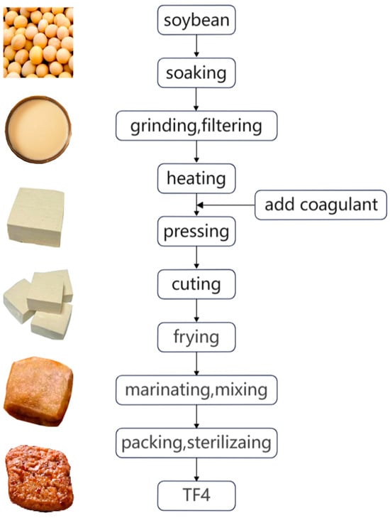 As one of the important crops in China, soybean contains many nutrients, such as proteins, vitamins, and minerals, and is an excellent resource of high-quality plant proteins [1]. Tofu (soybean curd), a traditional gourmet bean product, is a gel product with a three-dimensional network structure obtained by coagulating soybean proteins with coagulants. Studies have revealed that tofu could enhance immunity, prevent obesity, and reduce the risk of heart disease [2,3]. However, tofu is vulnerable to spoilage and has a short shelf life due to its high-water content and rich nutrients, which significantly limits its market recognition and the development of bean product processing industries [4]. Therefore, developing delicious, healthy, leisurely, and convenient instant marinated tofu products has garnered high importance. Similarly, marinated tofu, one of the representatives of tofu, must keep up with the trend and gradually be industrialized, standardized, and scaled up.