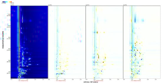GC-IMS spectrum of the samples (difference diagram). Note: 1. The background of the spectrum is blue; the vertical coordinate represents the gas chromatographic retention time(s), and the horizontal coordinate represents the relative ion migration time. 2. The color represents the concentration of the substance; white means the concentration is low, and red means the concentration is high; the deeper the color, the greater the concentration.