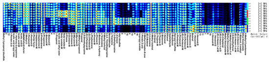 Gallery plot diagram of the samples of marinated tofu from different brands. Note: Each row represents all signal peaks selected in a sample, and every column represents the difference in signal peaks of the same substance in different samples; the darker the color, the higher the substance concentration and the stronger the signal peak.