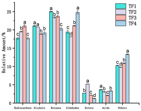 A total of 64 volatile substances were detected in four samples, including 11 hydrocarbons, 11 alcohols, 10 ketones, 15 aldehydes, 4 esters, 1 acid, and 12 other volatile substances (Figure 5). The results show that the volatile flavor compounds of the four marinated tofu were mainly composed of ketones, alcohols, aldehydes, and hydrocarbons, accounting for 20.32–25.03%, 18.89–21.10%, 18.13–24.80%, and 20.32–25.03%, respectively (Figure 6).