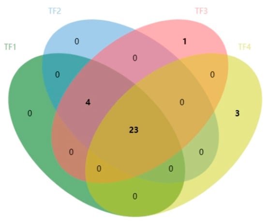 The final contribution of a specific compound to the overall aroma of a sample depends on its concentration and odor threshold measured by the odor activity value (ROAV) [26] (Table 5). The odor threshold refers to the lowest concentration of a certain aroma substance. The greater the ROAV, the greater the contribution of the compound to the overall flavor. Typically, a component with a greater ROAV value is considered the main contributor to the overall aroma of a sample [27]. In this study, a total of 31 volatile flavor compounds were detected by evaluating ROAV > 1 compounds in marinated tofu, including 23 volatile compounds in the four samples and 27 volatile compounds in TF1, TF2, and TF3. The 23 common volatile compounds were α-Pinene, β-Myrcene, (+)-Limonene, β-Phellandrene, 1-Butanol, 3-Methyl, 1-Pentanol, 1 -Hexanol, linalool, propanal, butanal, 3-Methyl butanal, n-Pentanal, (E)-2-Butenal, 1-Hexanal, heptaldehyde, (E)-2-Hexen-1-al, 1-Octanal, 1-Nonanal, acetic acid ethyl ester, 2-Butylfuran, 1,8-Cineol, 2-Pentyl furan, and methyl thiocyanate. 1-Penten-3-one only appeared in TF3, while (E)-3-Hexen-1-ol, 3-Hexanone, and (E)-2-Heptenal only appeared in TF4 (Figure 7 and Table 5). β-Myrcene, contributing to the spicy flavor, had the highest ROAV of 100, making a substantial contribution to the overall flavor. Simultaneously, linalool, 3-Methyl butanal, 1-Hexanal, 1-Octanal, and 2-Pentyl furan, with a ROAV ≥ 30, significantly influenced the overall flavor profile. The contents of monoterpenoids, such as (+)-Limonene, β-Myrcene, α-Phellandrene, and linalool, were relatively high in the samples, suggesting that they are the key volatile compounds in Zanthoxylum bungeanum [28].