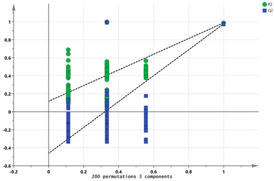 A partial least squares discriminant analysis (PLS-DA) can extract effective information about volatile compounds and reflect the differences in volatile substances among different samples. It is widely used to analyze the volatile substance characteristics of samples and is suitable for a situation with a large number of explanatory variables. R2X and R2Y stand for the explanation rate of the simulation to X and Y vectors, respectively, and Q2 denotes the prediction ability in the actual simulation. The parameters R2 and Q2, with values higher than 0.5 and near 1.0, were deemed as exact outcomes [29]. The results show that the independent variable fitting index (R 2X) was 0.964, the dependent variable fitting index (R 2Y) was 0.991, and the model prediction index (Q2) was 0.984, with R2 and Q2 exceeding 0.5, indicating that the model fit results were acceptable (Figure 8). The model Q2 of 200 permutation tests = −0.462, indicating that there was no overfitting phenomenon in the model, and the results are relatively reliable (Figure 9).