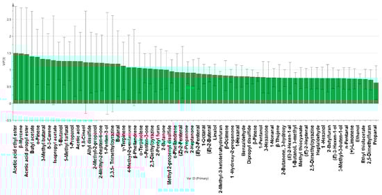 After detecting 64 odorant compounds in the four marinated tofu samples using GC-IMS, the VIP values obtained through a reliable PLS-DA matching model were used to evaluate the contribution of each odor compound to the overall aroma of marinated tofu. The weight of the PLS-DA model variables was measured using the variable importance for the projection (VIP). The greater the VIP value, the greater the contribution rate of volatile compounds to the overall flavor of marinated tofu. Flavor components with VIP values above 1.0 are considered discriminative indicator chemicals in many food specimens [30]. As shown in Figure 10, 26 volatile substances screened by PLS-DA significantly contributed to the flavor of marinated tofu (p < 0.05, VIP > 1). The key volatile substances of marinated tofu were identified through a comprehensive analysis with the ROAV value (VIP > 1, ROAV > 1), and the substances were as follows: α-Pinene, β-Myrcene, α-Phellandrene, 1-Penten-3-one, butanal, 3-Methyl butanal, acetic acid ethyl ester, 1,8-Cineol, and 2-Pentyl furan.