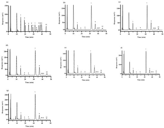 GC–MS chromatogram of standard monosaccharides (a); HPS-CK (b); HPS-120 °C (c); HPS-140 °C (d); HPS-160 °C (e); HPS-180 °C (f) and HPS-200 °C (g). Peaks: 1-Man; 2-Rib; 3-Rha; 4-GlcA; 5-GalA; 6-Nag; 7-Glc; 8-Gala; 9-Gal; 10-Xyl; 11-Ara; and 12-Fuc.