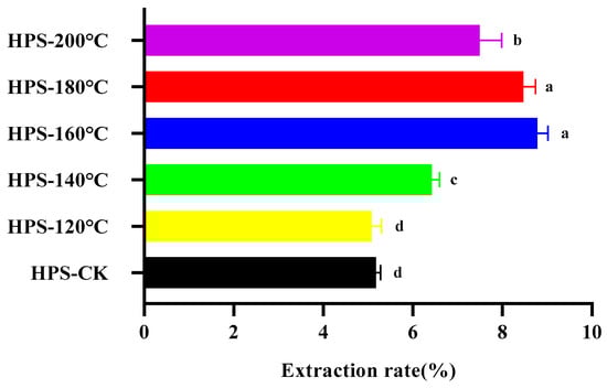The effect of SE temperature on the extraction rate of HPS. The same letter means that there was no significant change in different concentrations in the same group, and different letters mean that there were significant differences in different concentrations in the same group.