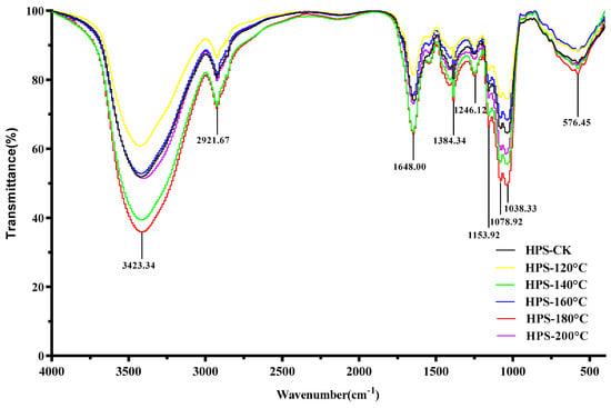 Figure 4 shows the infrared spectroscopy of the HPS. As can be seen from Figure 4, SE pretreatment did not change the spectral distribution of the HPS, but only changed the intensity of the absorption peak, indicating that the primary functional group of polysaccharides did not change after SE pretreatment. The result is congruent with Wang et al.’s [40] findings on the dietary fiber of Poria cocos peel residue after SE pretreatment. The HPS had strong absorption peaks at 3423.34, 2921.67, 1648.00, 1384.34, 1246.12, 1153.92, 1078.92, 1038.33, and 576.45 cm−1. The strong absorption at 3423.34 cm−1 belonged to the tensile vibration of O–H, indicating that HPS have intermolecular hydrogen bond forces, and the stronger the absorption peak, the greater the hydrogen bond force [41]. The peak at 2921.67 cm−1 represented the stretching C–H vibration [42]. The strong absorption at 1648.00 cm−1 was due to asymmetric tensile vibration in the C=O band [43]. The peak at 1384.34 cm−1 was due to the deformation vibration of C–H [44]. C–H is a functional group that is not easily oxidized and C–H bonds have lower bond dissociation energies than O–H bonds, and so they can provide a certain degree of antioxidant activity for polysaccharides [45]. The peaks at 1246.12 cm−1 were mainly caused by N=O and N=N tensile vibrations, C–N tensile vibrations, and C–H variable angle vibrations [46]. Three characteristic absorption peaks at 1153.92, 1078.92, and 1038.33 cm−1 were the characteristic absorption peaks of polysaccharides, representing the stretching vibration of C–O, C–O–C, or C–O–H, respectively, of the pyranose ring, among which C–O–H is the functional group mainly responsible for the antioxidant activity of polysaccharides [47,48]. This indicated that the HPS had polysaccharide characteristic structures, with the HPS polysaccharide characteristic structures extracted from H. marmoreus after SE pretreatment at 160–200 °C being more pronounced. It was worth noting that the absorption peak intensities of C–H and C–O–H in the HPS extracted from H. marmoreus by SE pretreatment at 160–200 °C were higher than those of HPS-CK, indicating that SE pretreatment can enhance the antioxidant activity of HPS by increasing the content of antioxidant groups in HPS.