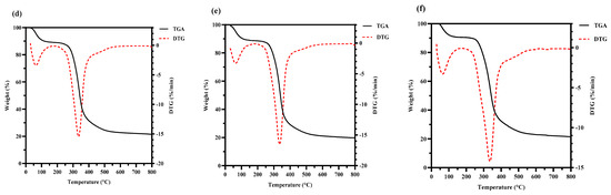 Thermogravimetry analysis (TGA) curves and derivative thermogravimetric analysis (DTG) curves of HPS-CK (a); HPS-120 °C (b); HPS-140 °C (c); HPS-160 °C (d); HPS-180 °C (e); and HPS-200 °C (f).