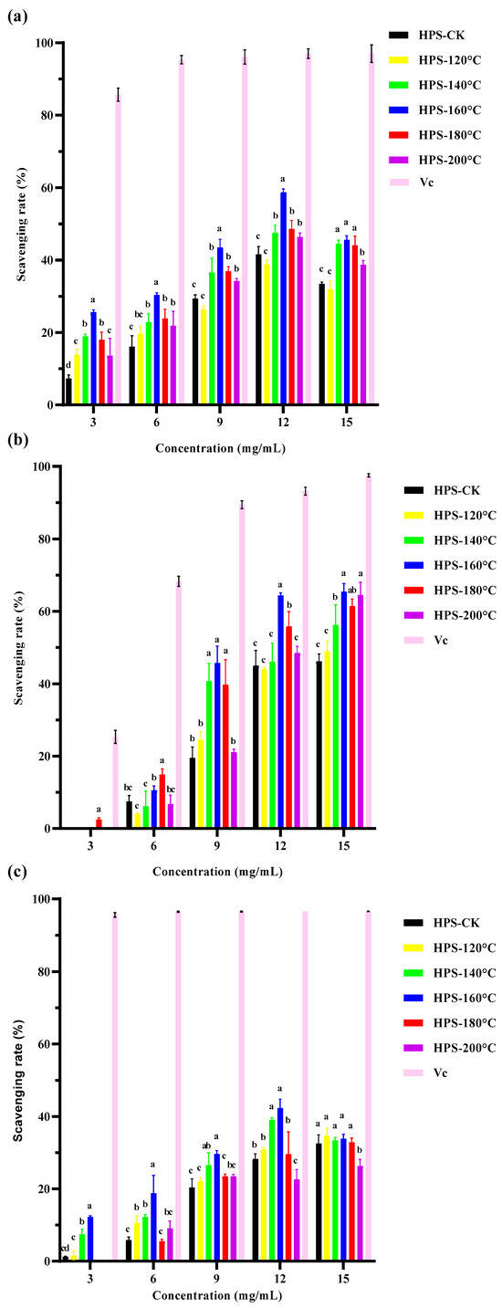 (a) DPPH (1,1-diphenyl-2-picrylhydrazyl) radical scavenging capacity of HPS; (b) hydroxyl radical scavenging capacity of HPS; (c) superoxide anion radical scavenging capacity of HPS. The same letter means that there were no significant changes in different concentrations in the same group, and different letters mean that there were significant differences in different concentrations in the same group.