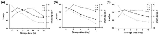 L*, a*, and b* values of the freshness indicator during storage at 25 °C (A); storage at 8 °C (B); storage at 4 °C (C).