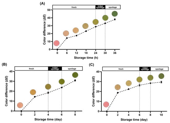 Color transitions and color differences (ΔE) of the freshness indicator during storage at 25 °C (A); storage at 8 °C (B); and storage at 4 °C (C).