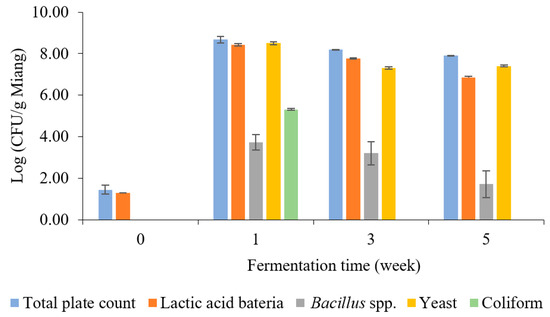 The enumeration of microbial counts related to the Miang fermentation process was investigated periodically, as indicated in Figure 2. Lactic acid bacteria (LAB) and yeast were the predominant microbes during Miang fermentation. After streaming, the total plate count was 1.45 log CFU/g Miang in the unfermented sample. Then, the viable cell count increased sharply at 1 week, with a total plate count of 8.67 log CFU/g Miang, and then showed a steady decrease to 8.18 and 7.90 log CFU/g Miang at the end of fermentation. LAB increased sharply at 1 week to 8.43 log CFU/g Miang and then declined to 7.77 and 6.86 log CFU/g Miang. LAB such as Lactoplantibacillus plantarum and Lactobacillus pentosus in the Miang fermentation process were considered to provide a probiotic function as these microbes have been found widely in Miang fermentation [15,29,30]. Yeast was determined to be one of the major microbes during the Miang fermentation process, which increased to 8.50 log CFU/g Miang in a week and then gradually decreased to 7.31 and 7.40 log CFU/g Miang. Yeast was expected to play a significant role in metabolizing polysaccharide and enzyme activities, which encourage the formation of flavors and texture profiles of the final product, particularly Candida ethanolica and Pichia manshurica, which were previously reported as the major yeast species in fermented tea [17,31]. Bacillus spp. was 3.74 log CFU/g Miang at 1 week and declined steadily to 3.21 and 1.17 log CFU/g Miang. Bacillus spp. were expected to have important roles using their enzyme activity in the initial stage of fermentation [22,32].