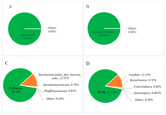 Relative abundance of the fungal communities at the phylum (A), order (B), family (C), and genus (D) levels of Miang.